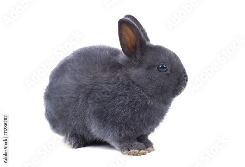 © Irina K., Obraz premium Gray fluffy dwarf rabbit sits on a white background. Isolated