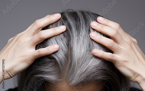 © Wuttichai, Obraz premium Gray hair health portrait. Close up concept of natural and scalp. Beauty and care. View illustrating and scalp
