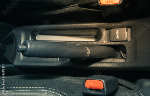 Fototapeta premium Gray Hand Brake and Seatbelt Lock Inside Car in Vintage Tone