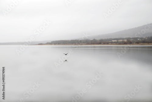 Naklejka premium gray heron flying over mountain lake and reflected in the water