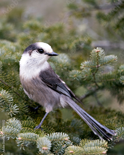 © Aline, Naklejka premium Gray Jay stock photos. Close-up profile view perched on a fir tree branch in its environment and habitat, displaying grey feather plumage and bird tail. Christmas picture ornament. Christmas card.