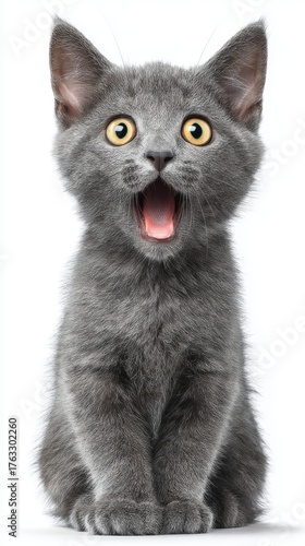 © Aether Pixels, Obraz premium Gray Kitten Sits and Yawning Portrait on White Background Frontal View Cute Expression Big Eyes Open Mouth Pet Animal