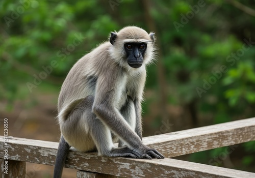 Fototapeta premium Gray Langur Monkey Sitting on Wooden Railing