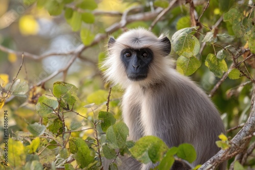 Fototapeta premium Gray langur resting on a leafy branch during a sunny afternoon in the Indian...