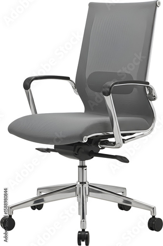 Fototapeta premium Gray mesh office chair with adjustable features, perfect for modern workspaces.