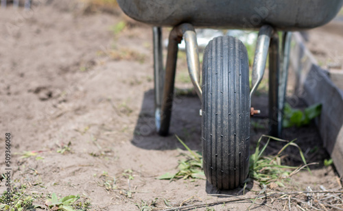 Fototapeta premium Gray metal garden wheelbarrow with two handles and one wheel. The wheelbarrow is in the garden or garden. Gardener's wheelbarrow in the backyard. Garden cleaning.