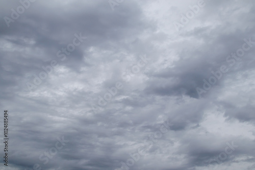 Obraz premium Gray rain clouds loaded with rain in the sky. Overcast sky with dark clouds. Dark sky before a thunderstorm.