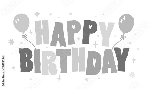 © Lin, Fototapeta premium Gray scale happy birthday typography vector with gift balloon cake pattern. Cute girl hand drawn style colorful lettering icon Greeting card invitation card decoration design Funny childish birthday