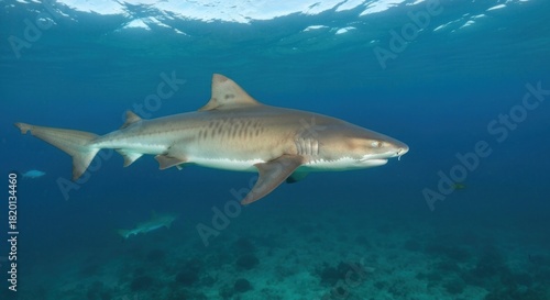© Darminah, Fototapeta premium Gray shark swimming in clear blue water over coral reef