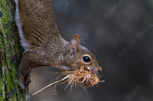 Obraz premium Gray squirrel, climbing down a tree carrying nesting material in his mouth