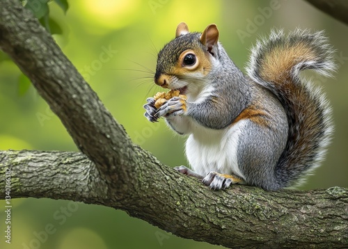 © Mind, Fototapeta premium Gray Squirrel Eating Nut on Tree Branch Outdoors