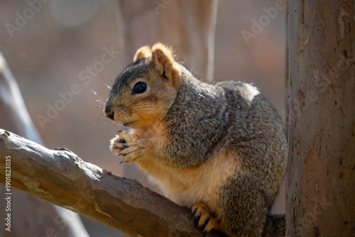 Obraz premium Gray squirrel eating nut while perched on tree branch