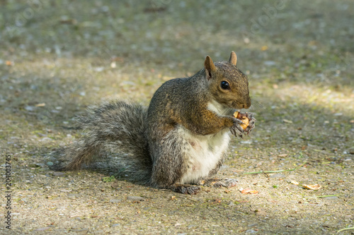 © Brambilla Simone, Fototapeta premium gray squirrel in front of a tree eats a hazelnut holding it with paws.
