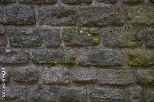 © Анна Климчук, Obraz premium Gray stone wall with moss texture, old masonry background. Natural rough surface, historical architecture detail, and aged stone pattern.