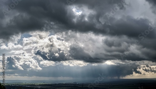 © Sam, Obraz premium gray stormy dramatic sky with overcast and heavy textured cumulus clouds and backlight large panoramic view