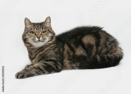 © Hanna Darzy, Fototapeta premium Gray striped cat lies on gray
