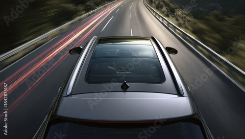 Fototapeta premium Gray SUV speeding on highway. Sunroof visible