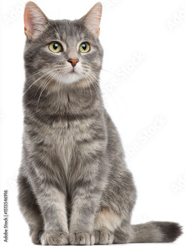 © Gilang, Fototapeta premium Gray tabby cat sitting and looking forward, with green eyes and soft fur, isolated on white background. Perfect for pet, cat lover, or animal care content.