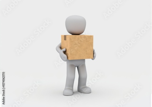 © ALEXEY FILATOV, Obraz premium gray toy man 3d carries in hands a cardboard box on white background