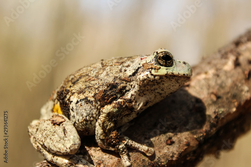 © Kelsey, Obraz premium Gray Treefrog Ready to Leap From Branch Looking at Camera