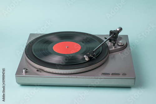 © kvladimirv, Fototapeta premium Gray turntable on a light blue background.