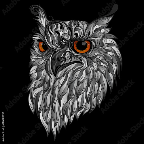 © soul_of_phoenix, Fototapeta premium Gray vector owl with fiery eyes on a black background