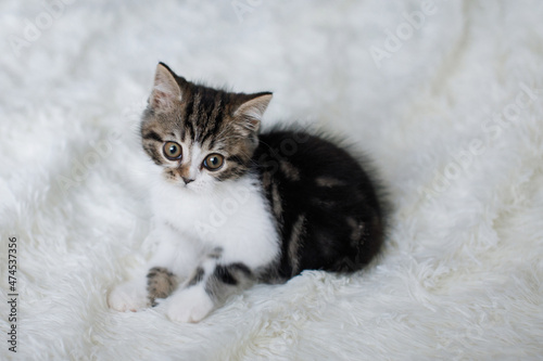 Fototapeta premium Gray white fluffy kitten sits on bed
