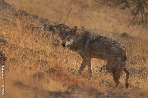 Obraz premium Gray wolf at Bhigwan grassland, India