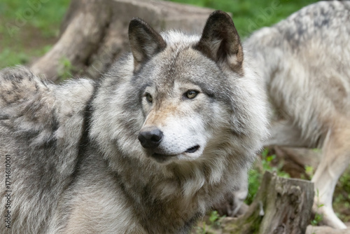 Fototapeta premium Gray Wolf Head (Canis lupus) Close Up in Forest Habitat