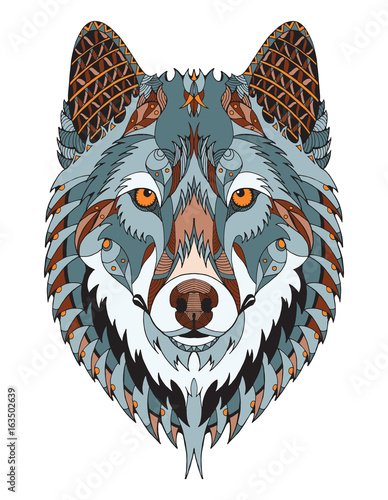 Obraz premium Gray wolf head zentangle stylized, vector, illustration, freehand pencil, hand drawn, pattern. Zen art. Ornate vector. Color.