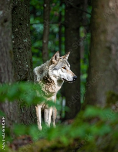 © Jhon, Obraz premium Gray wolf in a lush forest