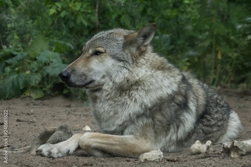 Fototapeta premium Gray wolf laying in the forest