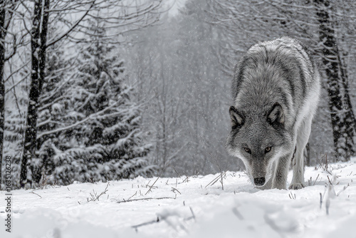 © Hopeful Day, Fototapeta premium Gray wolf moving low through deep snow in dense winter forest