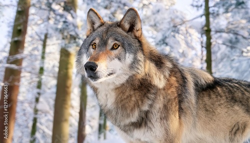 Obraz premium Gray wolf standing in snowy forest during winter