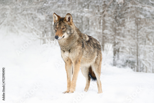 © fotomaster, Fototapeta premium gray wolf standing on the snow in the forest