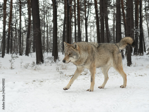 © fotomaster, Obraz premium gray wolf walking on the road in the forest