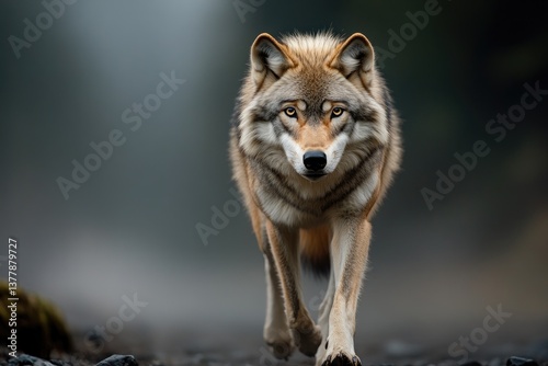© Lubos Chlubny, Obraz premium Gray wolf walking towards observer in misty forest