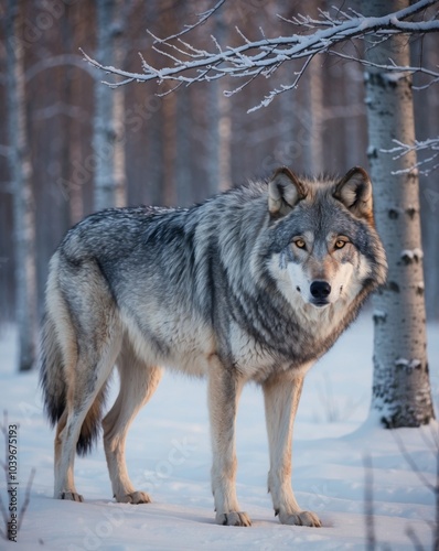 Obraz premium Gray wolf with a shaggy coat standing in a snowy forest during winter twilight.