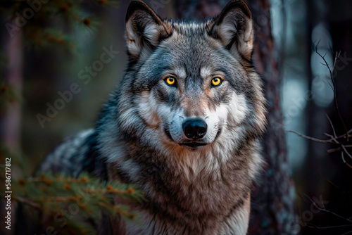 © Renan, Fototapeta premium Gray wolf with golden eyes staring at the camera, AI Generated