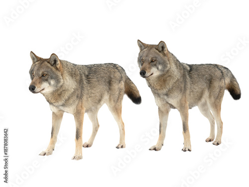 © fotomaster, Obraz premium Gray wolfs snow isolated on white background