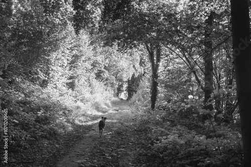 © Wirestock, Obraz premium Grayscale shot of a dog walking on a pathway in a forest