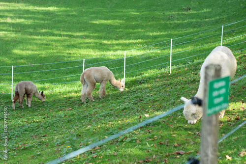 Naklejka premium Grazing alpacas enjoy their day on a sunny hillside, surrounded by lush green...