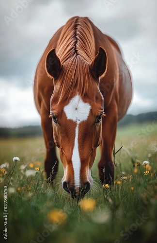 © yevgeniya131988, Obraz premium Grazing Brown Horse with White Markings at Equestrian Farm