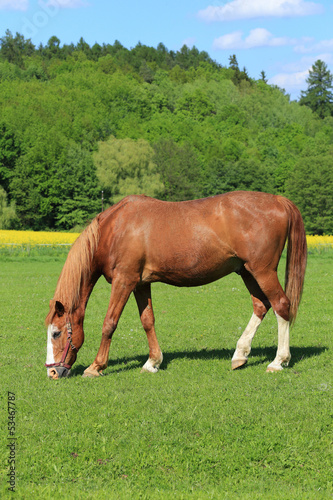 © Kajano, Fototapeta premium Grazing brown Horses on the green Pasture