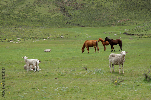 Fototapeta premium Grazing horses and sheep, Lesotho
