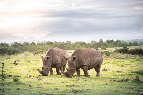 © Hussmann, Fototapeta premium Grazing rhinos in the fynbos South Africa