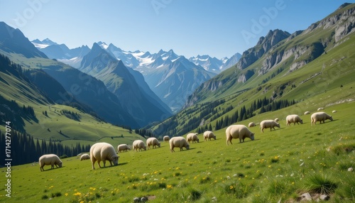 © Muhammad, Fototapeta premium Grazing Sheep on Lush Green Mountain Meadow Under Clear Blue Sky and Surrounded by Peaceful Alpine Peaks