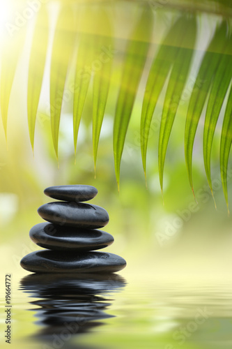 © logoboom, Fototapeta premium Grean bamboo leaves over zen stones pyramid over water