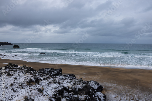 Fototapeta premium Great beach in Iceland where turquoise water meets golden sand and white snow.