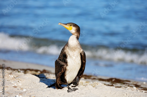 Naklejka premium Great black cormorant, Phalacrocorax carb, dry feathers on the sea beach....